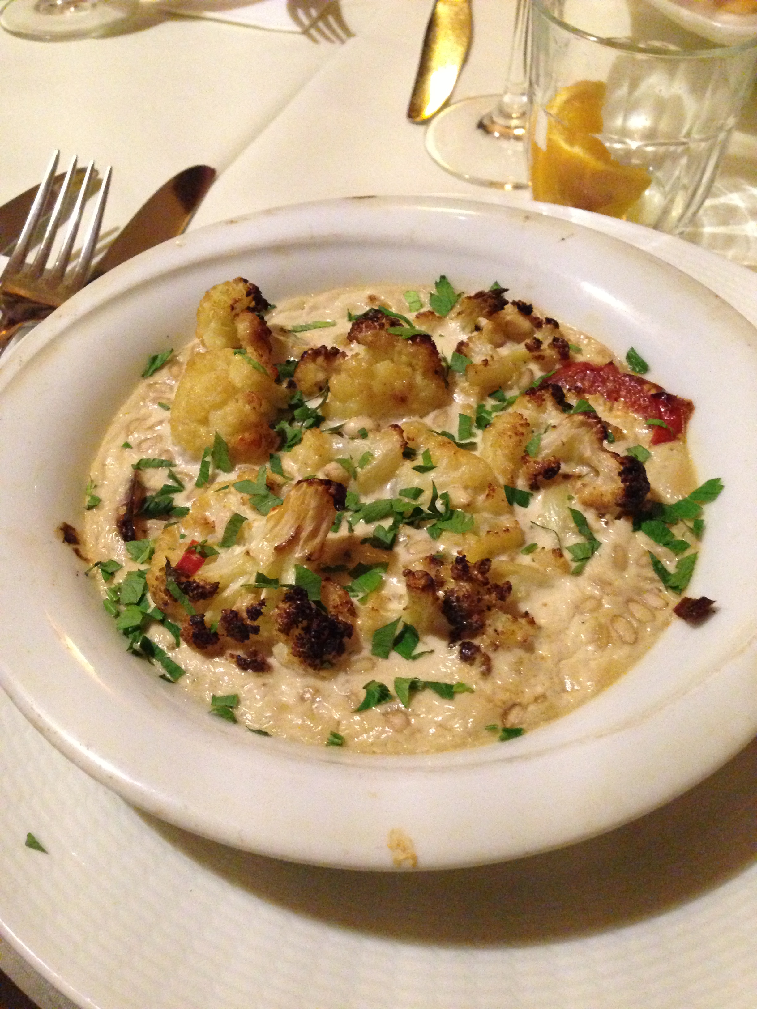 For main I chose cauliflower siniya; it is cauliflower baked in tehina with pine nuts. I asked the aforementioned waiter what siniya was and the enthusiasm in which he described the dish was what inspired me to order it. I wasn’t thinking rationally, for if I had been, I would have known I wouldn’t be satisfied eating only vegetables whilst my friends tucked into meat and chicken. It was a unique dish, but felt a little too much like eating halva for my liking, and I wouldn’t recommend it as a main unless you actually are a vegetarian, that likes halva.
