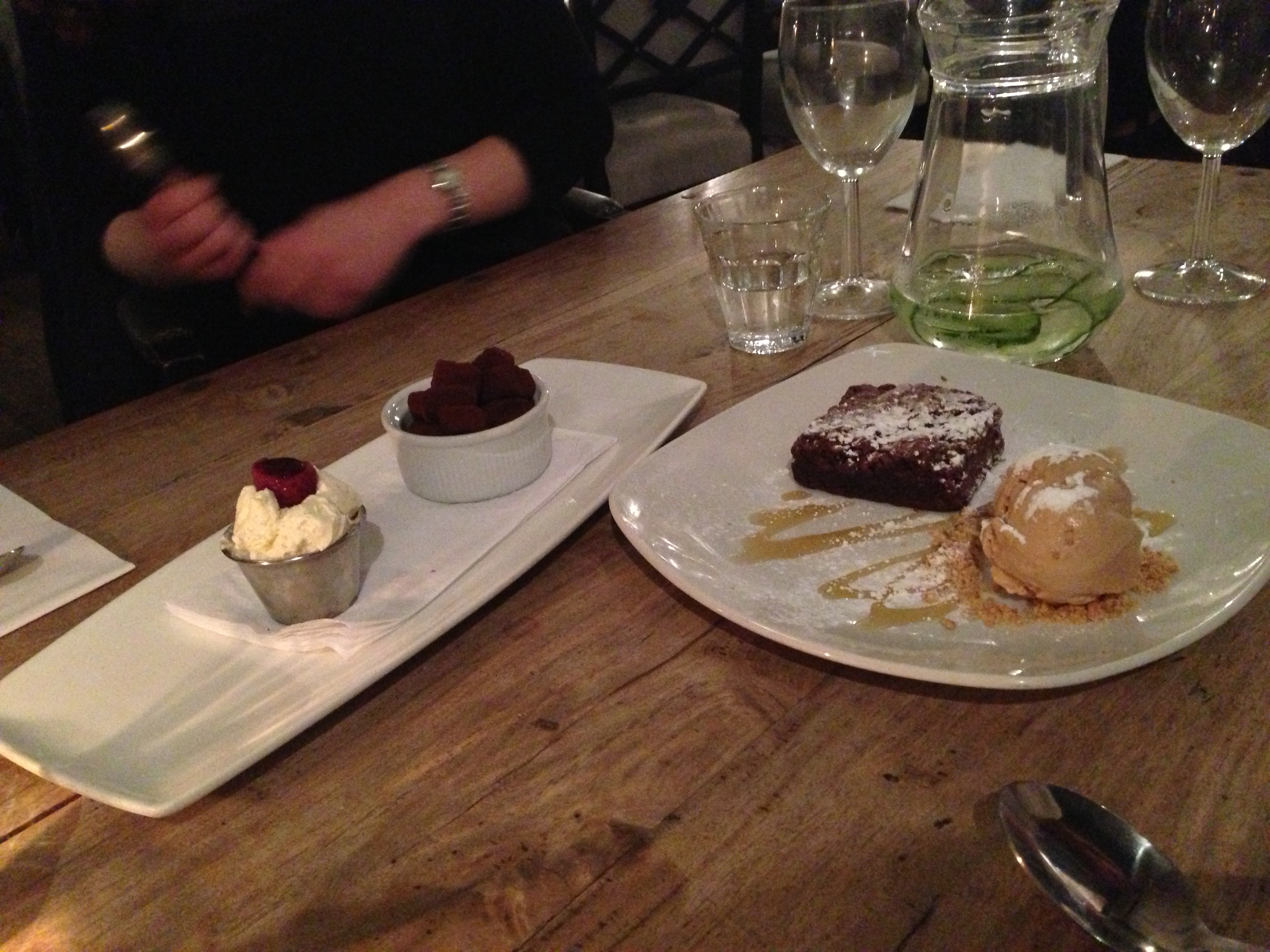I had fond memories of the brownie with salted caramel ice cream from last week so recommended it for dessert; we shared a brownie and the chocolate truffles. The truffles were served with a tiny pot of mascarpone which did a great job of making the truffles a little less rich whilst still preserving their chocolate intensity. The brownie was, as expected, to die for as was the ice cream.