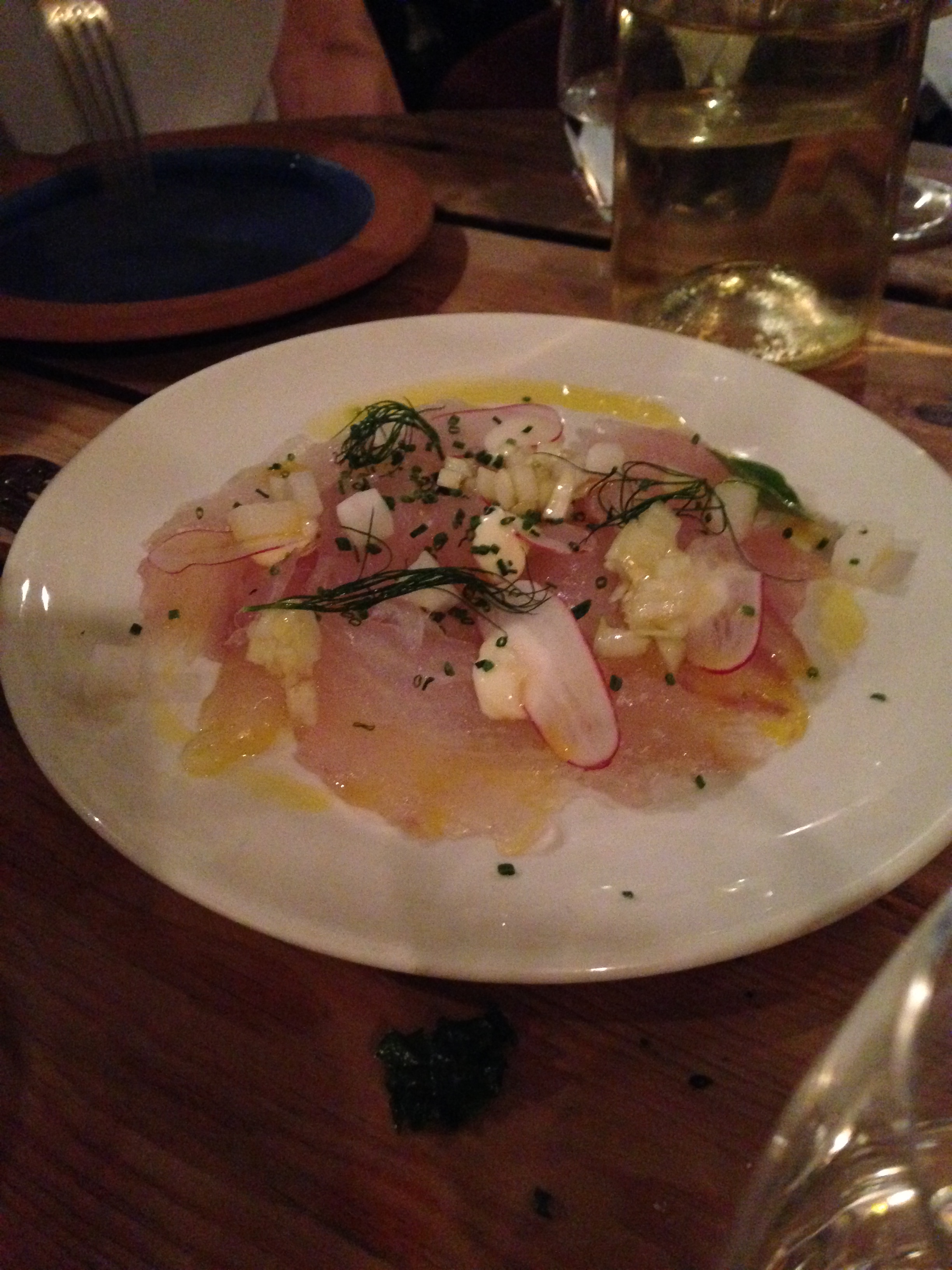 First came a delightful bread basket with scrumptious sourdough bread. Next was fennel cured pollock, lamb chips and beef cigars.