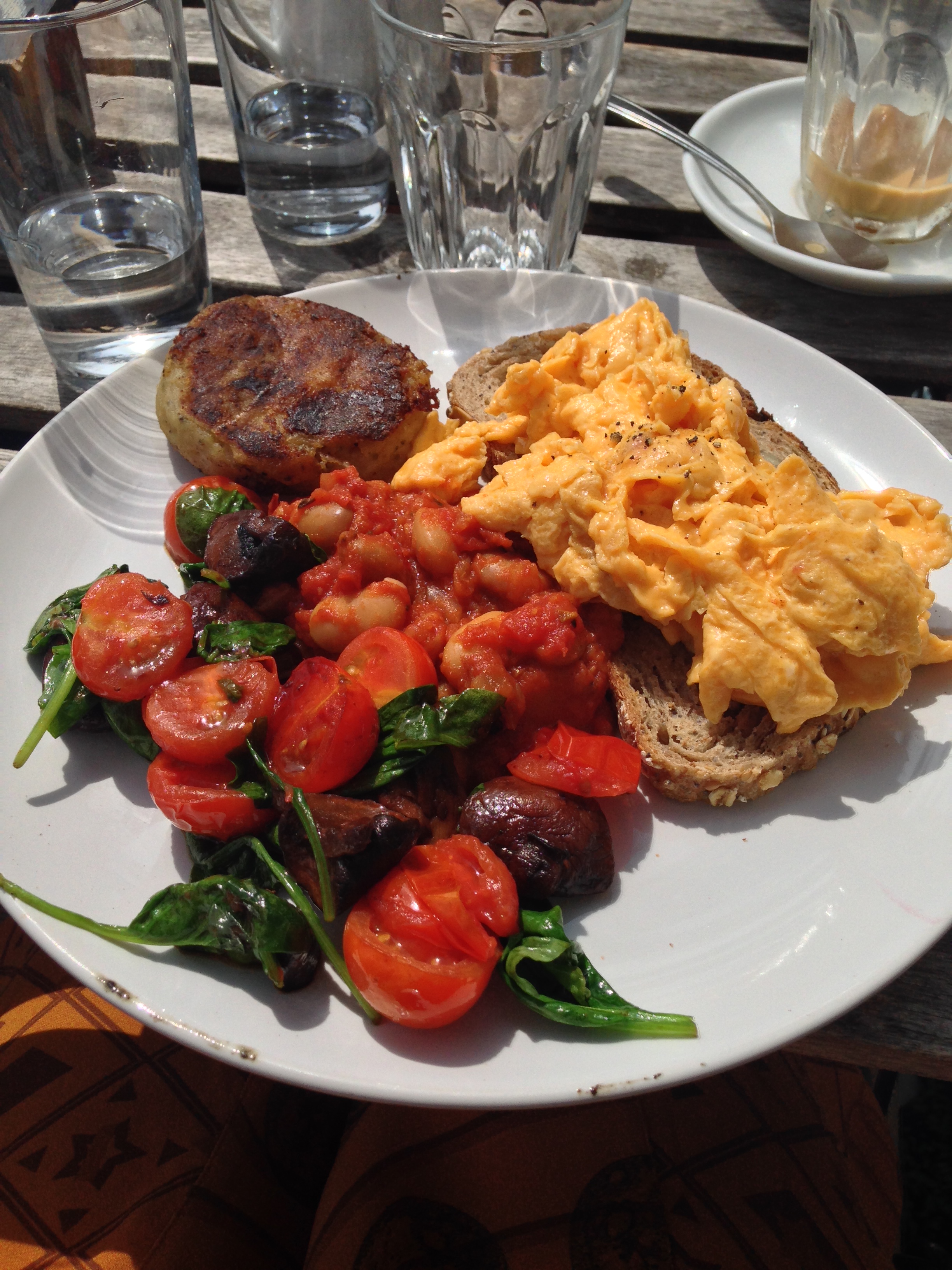 Good quality rustic granary bread, juicy tomatoes, tasty spinach, well cooked scrambled eggs and an interesting potato cake… no complaints.