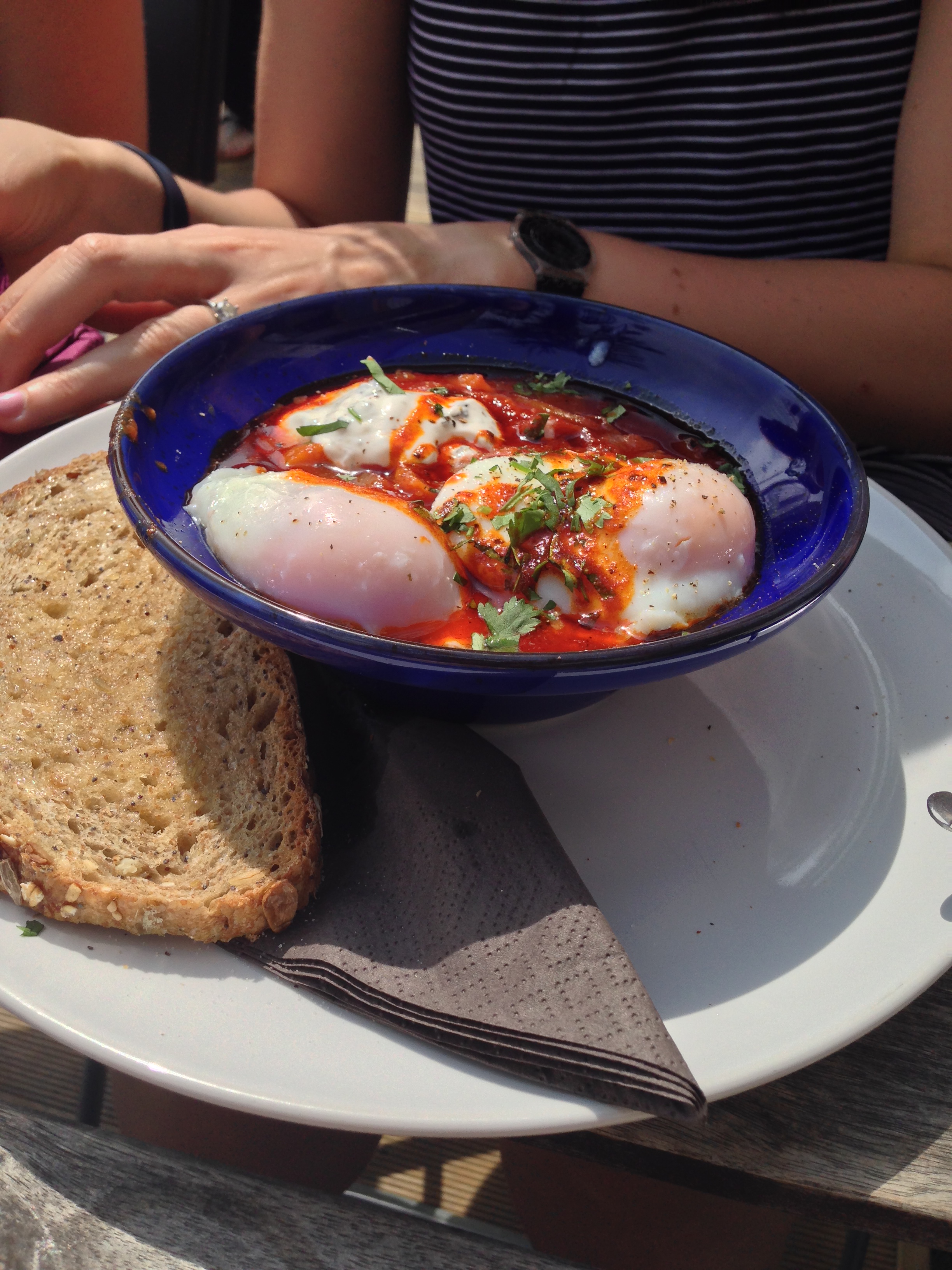 Upon arrival we joined the queue to order food, whilst a table was found for us. The queue was long but this gave me confidence that the food would be worth the wait. Most of the brunch classics were there, as well as turkish eggs (poached eggs with tomato, yoghurt and spices). Three of us opted for the vegetarian breakfast and one daring friend went for the Turkish eggs.