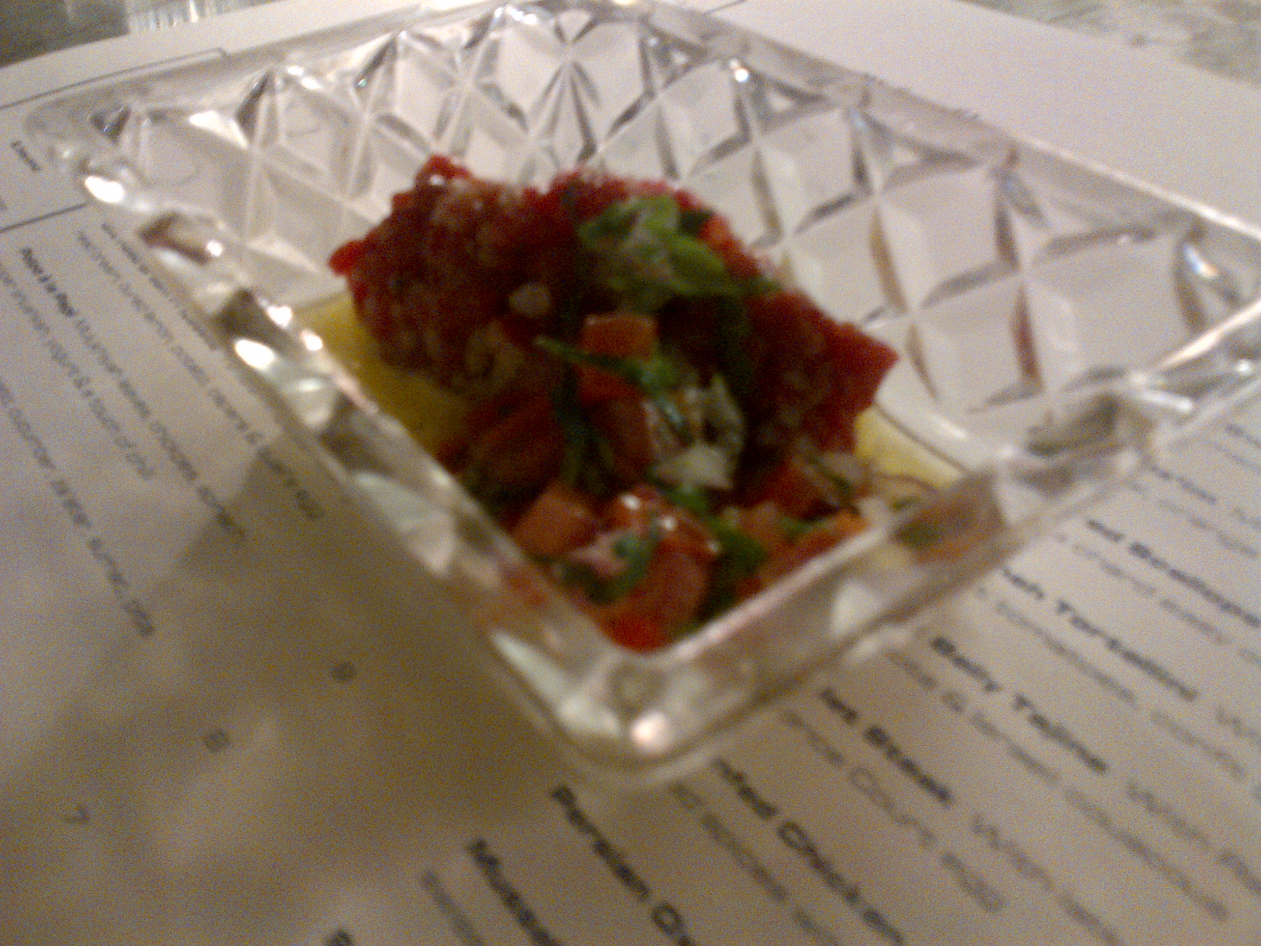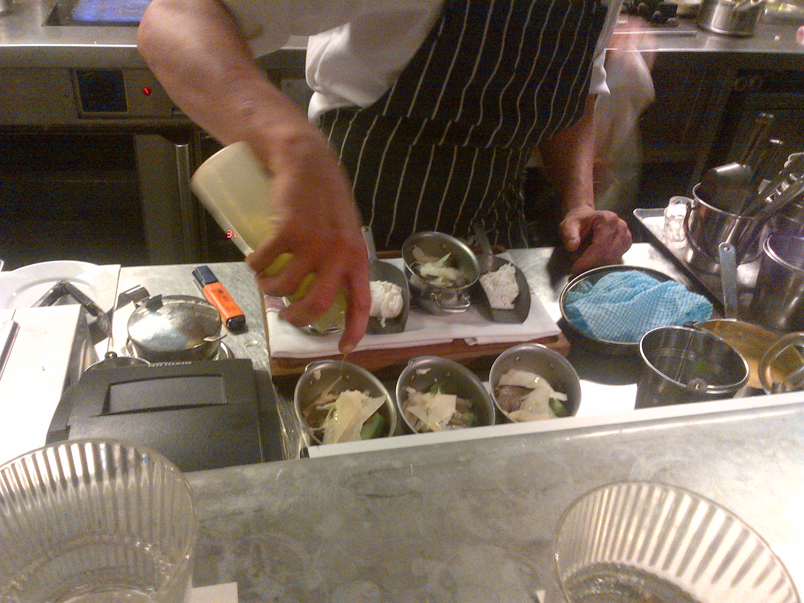 We were shown to our space at the bar, on the far right, and were greeted by Thomas, second in command in the kitchen. Not only was Thomas second in command; he took our order, served our food, answered our many questions, discussed life and love with us and plied us with shots.
