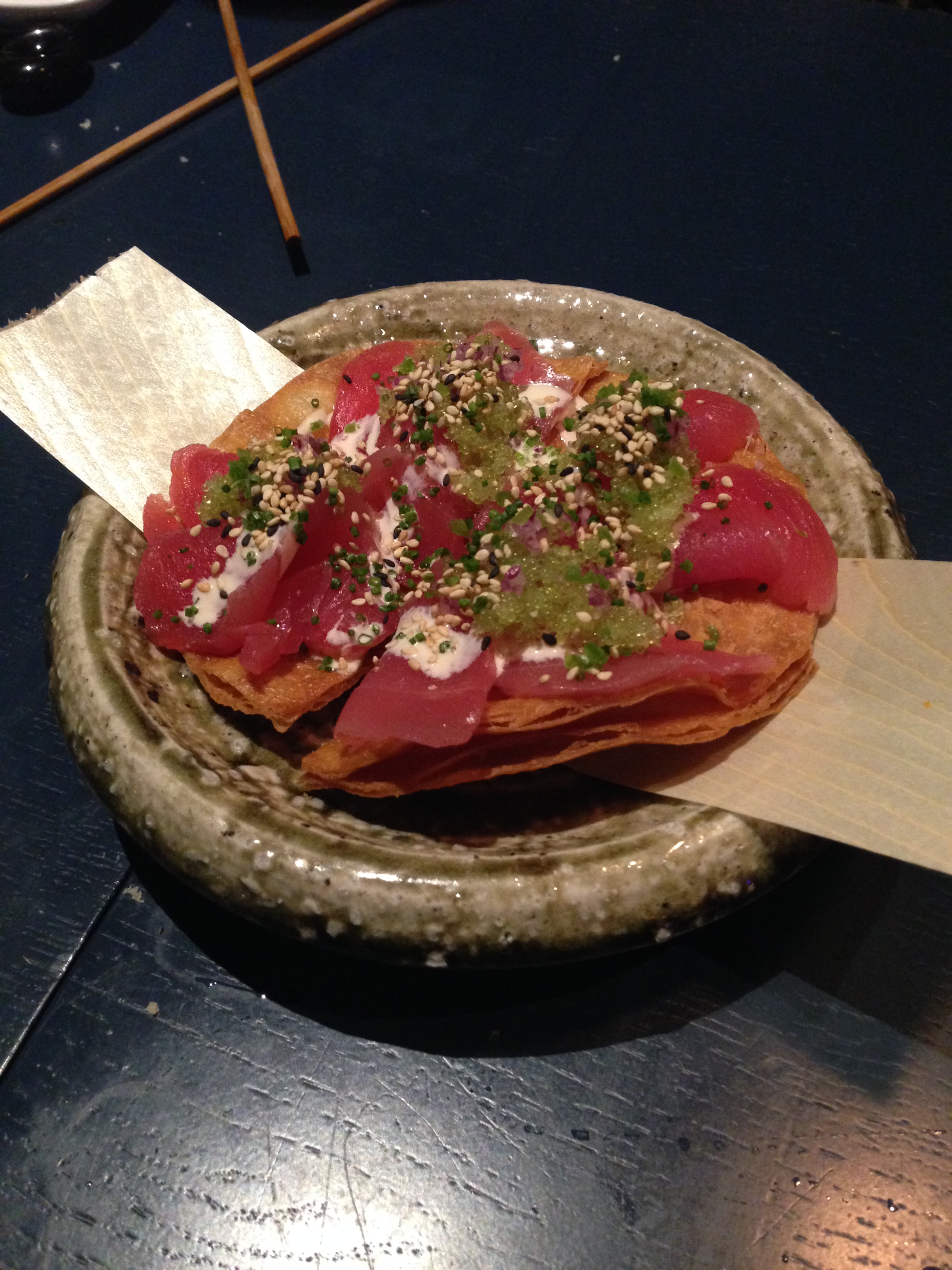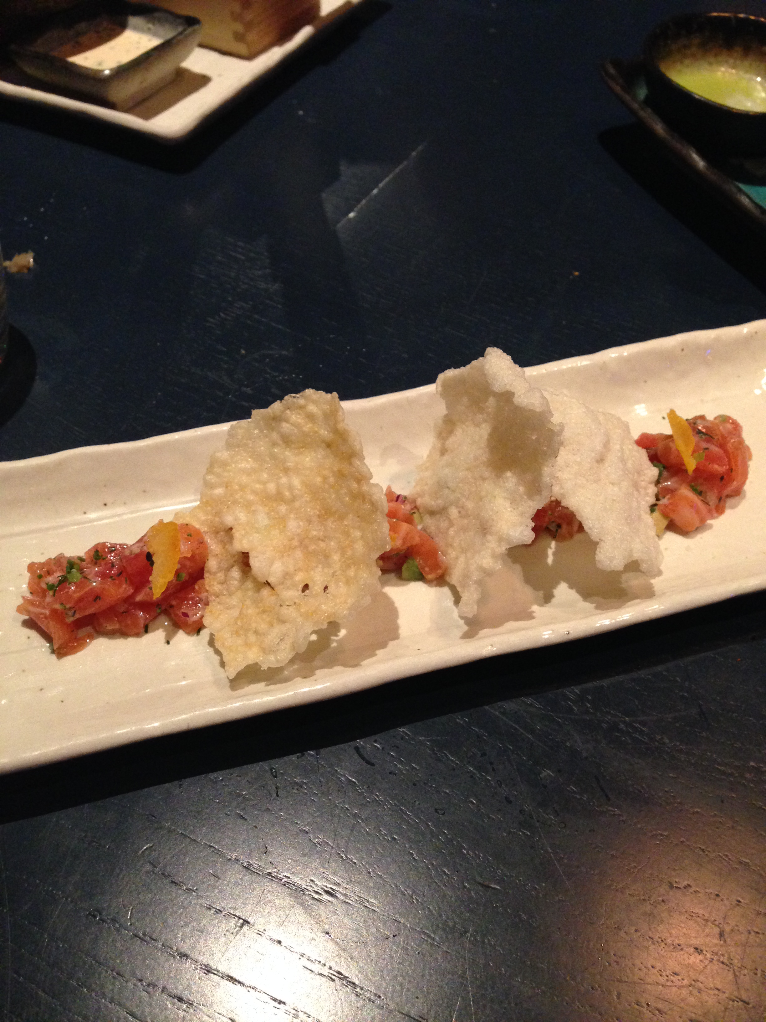 One by one, our eclectic mix of dishes began to arrive. Edamame, so simple yet so full of potential, as evidenced here flamed with sake, butter, sea salt and lemon. Next the crunchy rice senbei crisps with avocado and jalapeño dip. This was a nice side dish (a cross between a prawn cracker and a rice cake) but not terribly exciting.