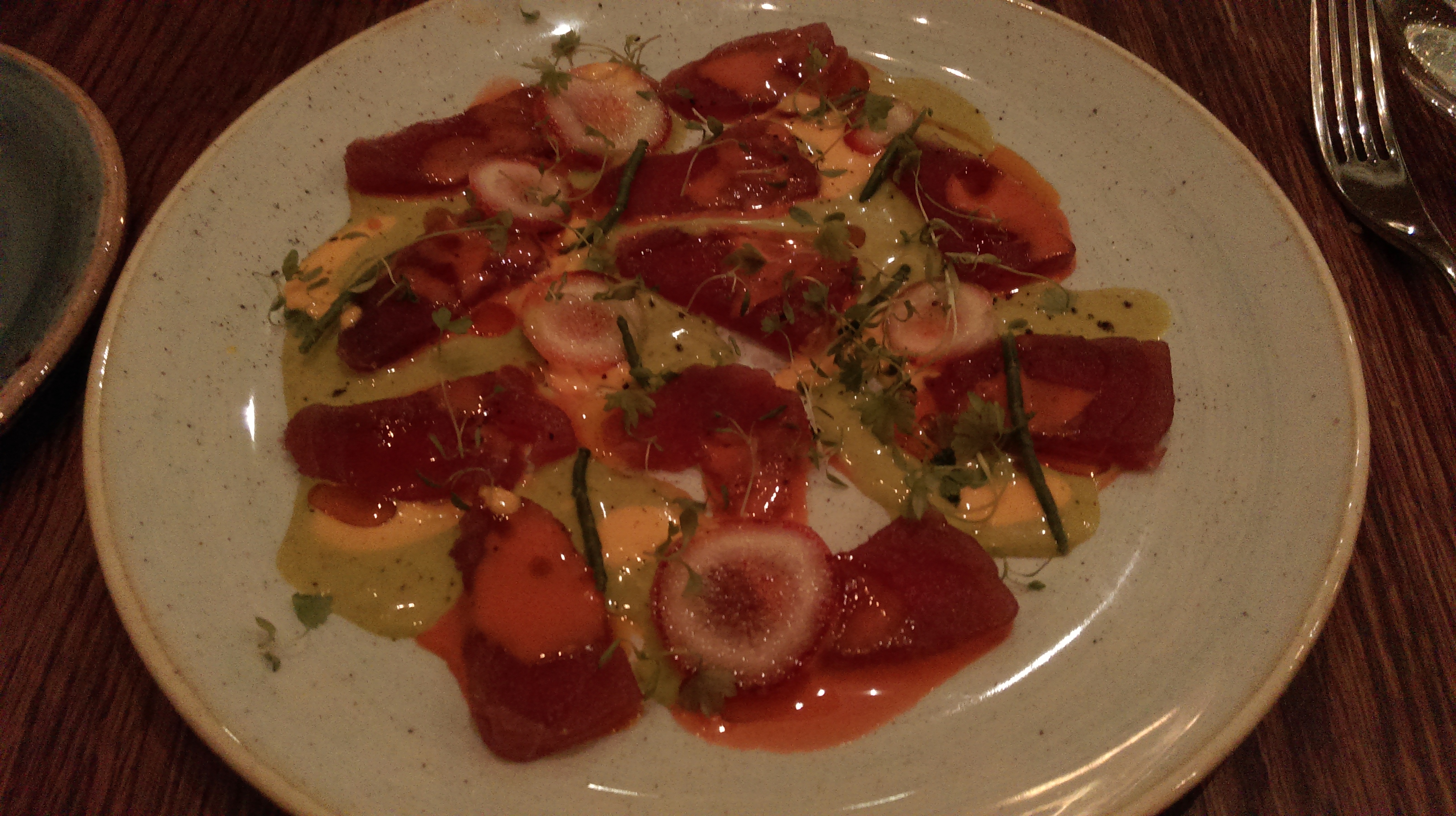Putting restaurant placement and January thriftiness aside, we moved on to more important things: food. Two of us shared seared tuna and sea bream ceviche to start, having been told by the waiter that the tuna was the best dish. He wasn’t wrong, I was a big fan. It was served with green tiger’s milk sauce (as are many of the dishes), radish and asparagus. Note that tiger’s milk is actually from a cow rather than a tiger, but spiced up. The sea bream ceviche came in a bowl of tiger’s milk with avocado and crispy onions. This was also excellent and I particularly enjoyed feasting on the sauce long after the fish was finished with the dainty implement provided (half spoon half fork).