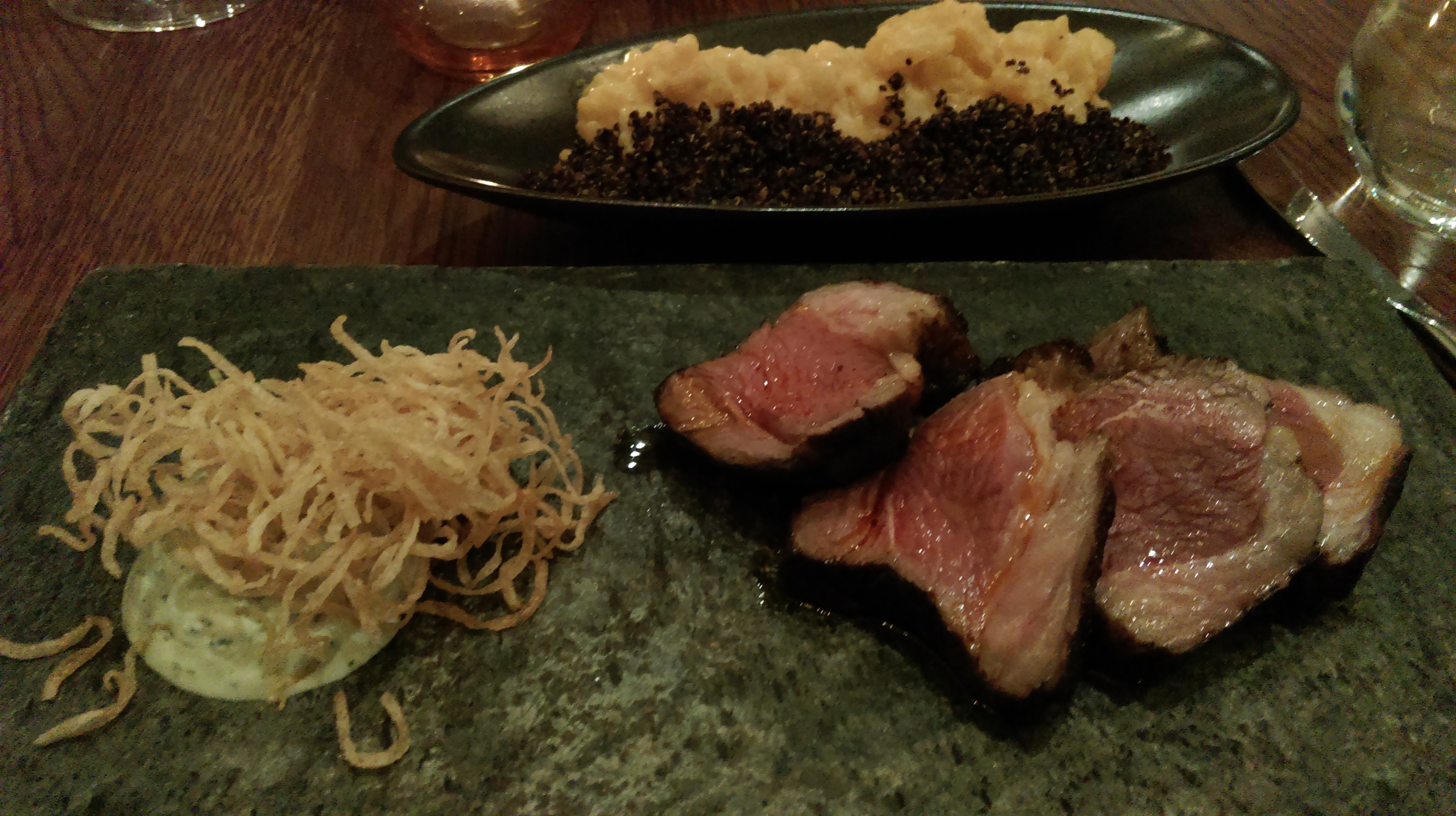 For main we shared lamb rump with quinoa and hot sea bass ceviche served with (no prizes for guessing this one) hot tiger’s milk and sweet potato. It’s amazing how different this tiger’s milk tasted though. Having loved the previous sauces I did not care for this one, as I found it far too tangy, but I should point out I was very much in the minority here. The fish by itself was very cooked well. We also shared a Cisco corn cake which was tasty, arguably in need of a spicy sauce but again my fellow diners were not in agreement with me.