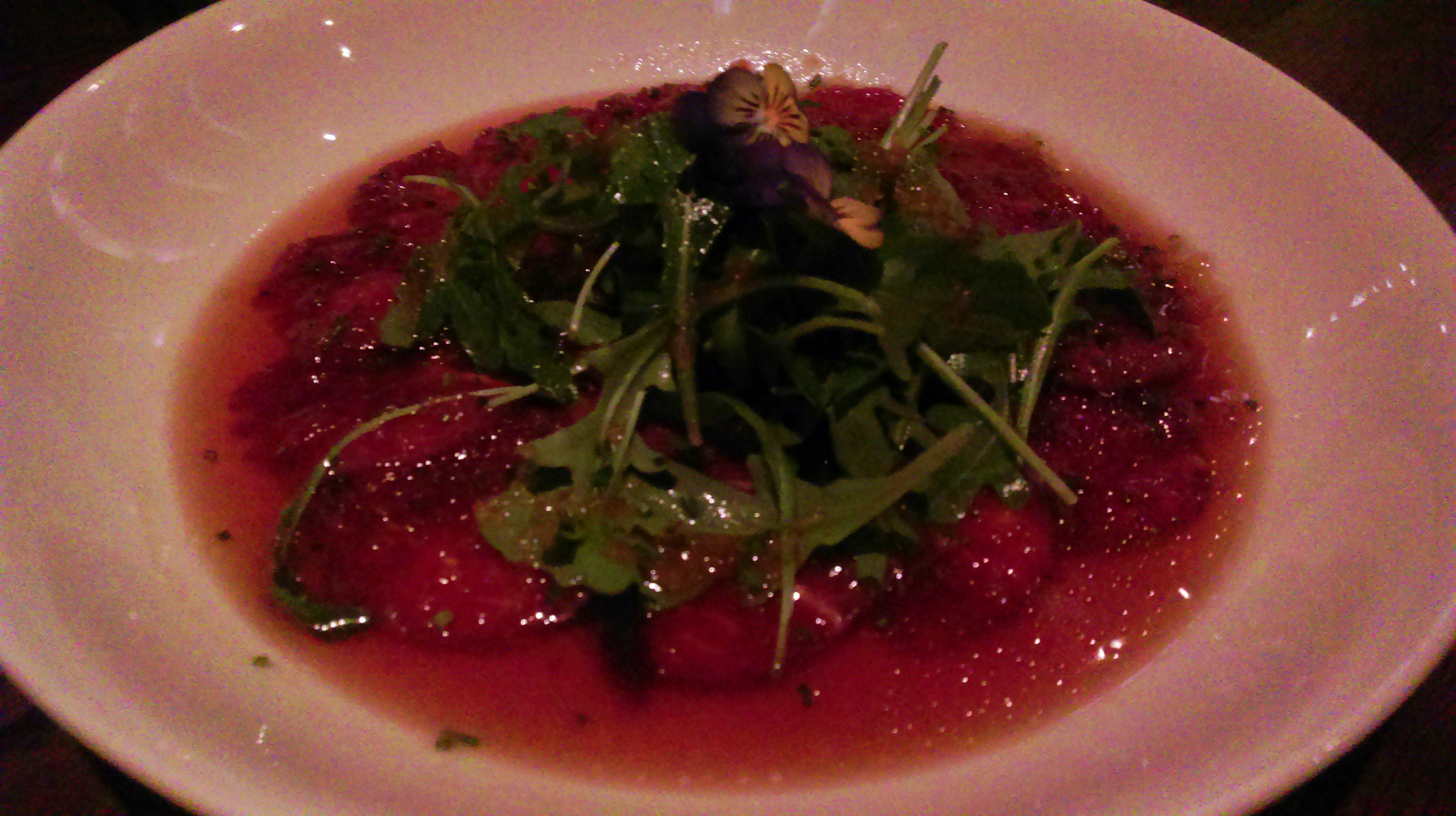 We had beef carpaccio with yuzu truffle dressing, sashimi salad (salmon, tuna and seabass), nasu dengaku (aubergine with miso paste), chicken gyoza and horenso goma-ae (poached spinach marinated with sweet ground sesame sauce). The carpaccio was pretty spectacular, and looked beautiful garnished with flowers. The sashimi salad was great, nasu dengaku very slightly tough (difficult to cut with chopsticks) but I really liked the miso paste. The gyoza were noted as being very hot (with respect to temperature rather than spice level), which in my books is no bad thing. The spinach was very nice where touched by sauce, otherwise a tad dry and boring.