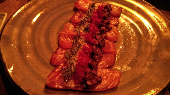 Soy cured salmon with red onion, shiitake and dill was accompanied by a delightful whilst intense miso mustard dressing.